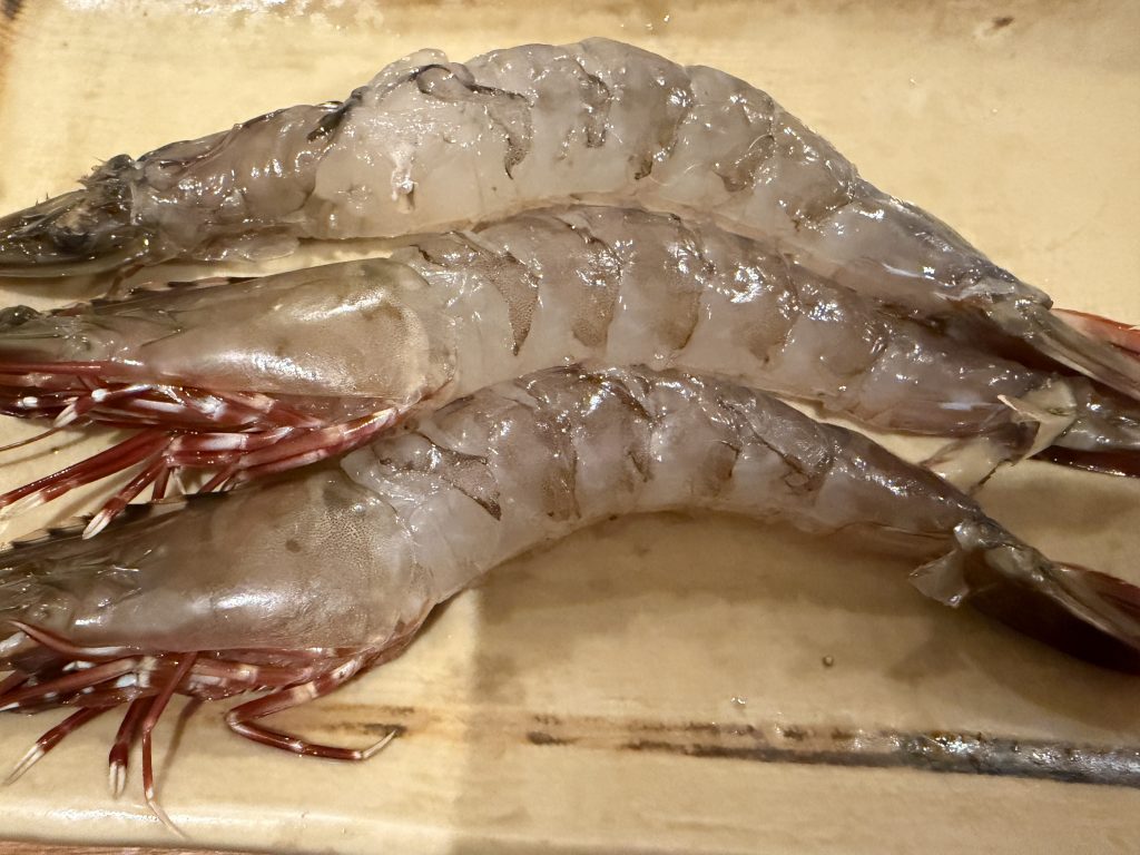 昨日のセイコ蟹を食べた時に一緒に食べた地物の「上関町活き車海老」です。